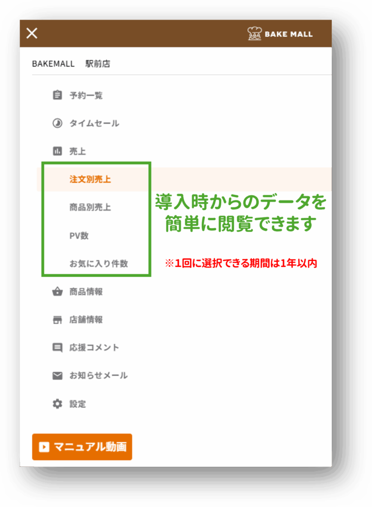 これまでは「直近1年分」しかみられなかった売上やPV数データが、ベイクモール導入時からすべて閲覧可能に