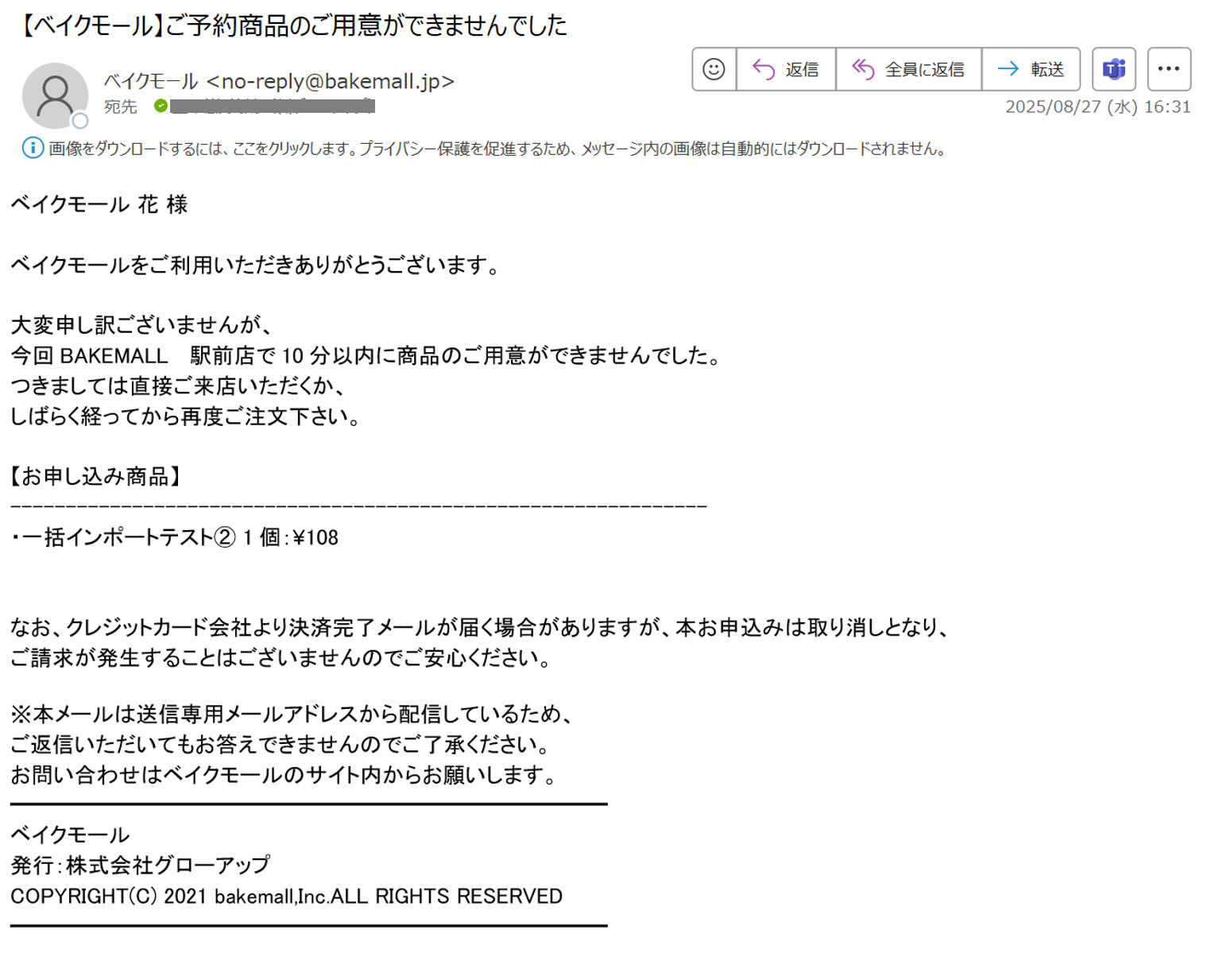 この場合は、お客様に予約キャンセルのメールが自動送信されます。